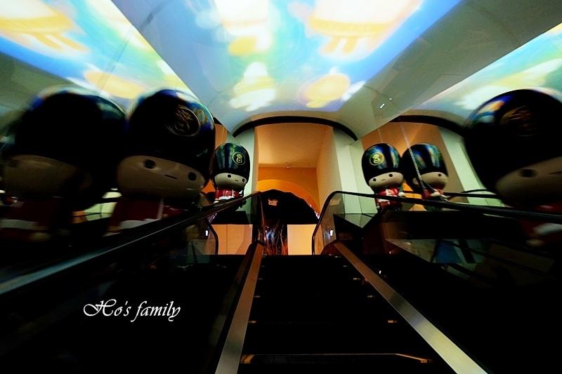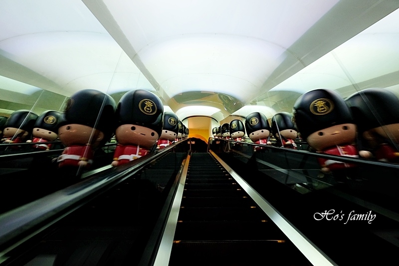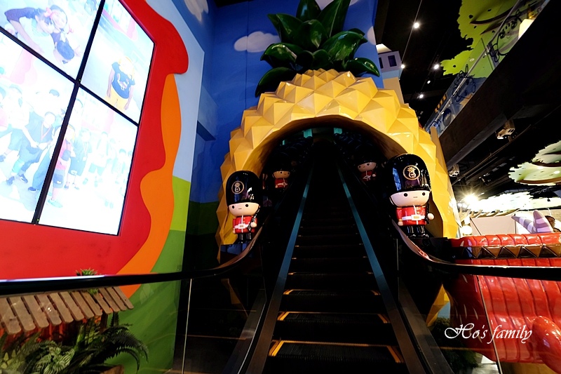 維格餅家黃金菠蘿城堡最大亮點就是有個「鳳梨隧道電梯」,搭乘手扶梯穿越鳳梨時光隧道,兩旁的士兵會響起奏樂歡迎大小旅人到來,好熱鬧的歡迎儀式, 穿越過鳳梨時光隧道會旺旺一整年唷!