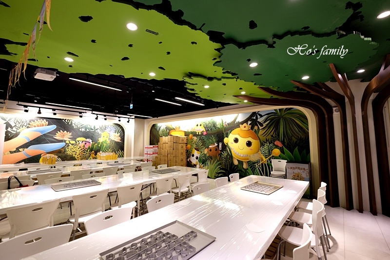 看完師傅做鳳梨酥,輪到我們自己來DIY。維格餅家黃金菠蘿城堡的DIY教室寬敞又漂亮,旁邊有幾幅生動的彩繪壁畫非常有趣