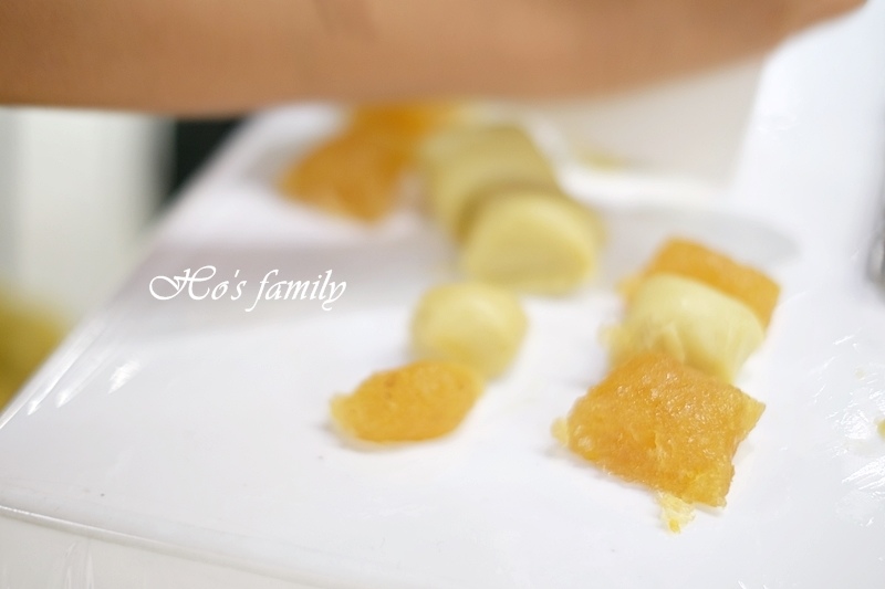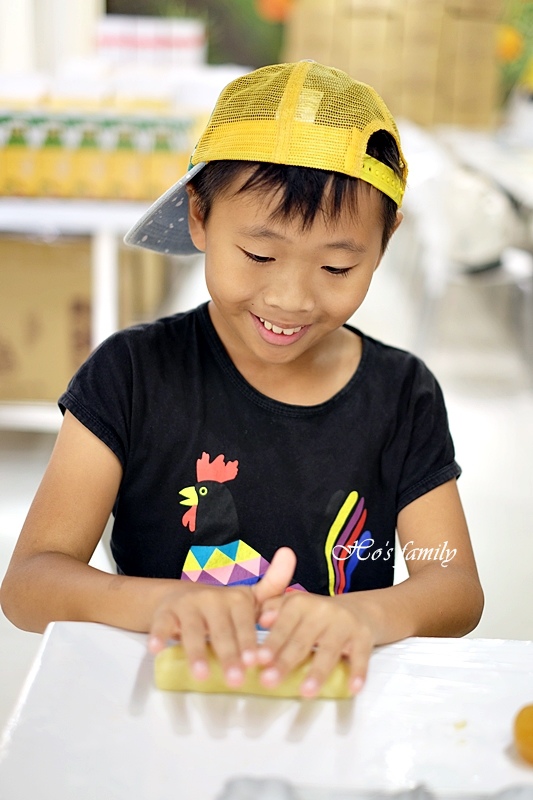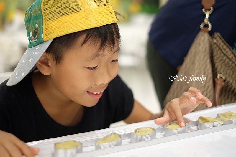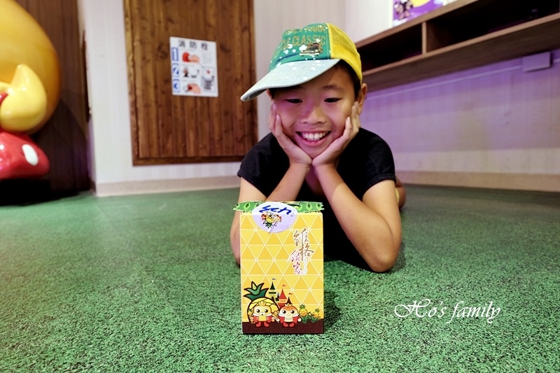 最重要的是可以隔著透明櫥窗看到師傅做鳳梨酥的過程,做好的鳳梨酥可以每個人拿一塊,Yo開心極了,小孩真的有得吃就搞定了,笑翻了!