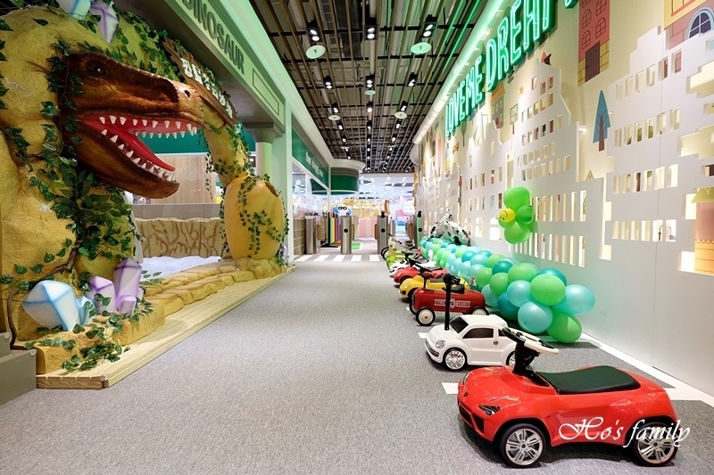 恐龍沙坑博物館、修車場、家家酒、氣送球道、寵物玻璃屋…應有盡有,尤其一整排嚕嚕車排排站,任孩子自由選擇騎著穿梭在街道,最吸引小車控!