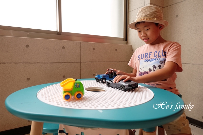 角落的小桌子是秘密基地,Yo帶著小車車在此玩得不亦樂乎