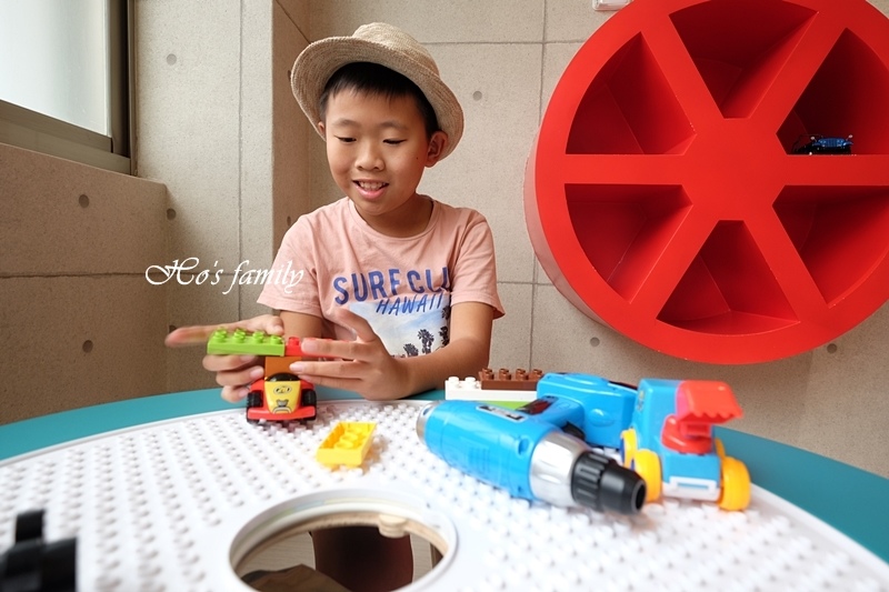 赫然發現,桌子中間的洞穴裡居然還有積木,整張桌子成了創作基地,更加引起Yo的興趣!