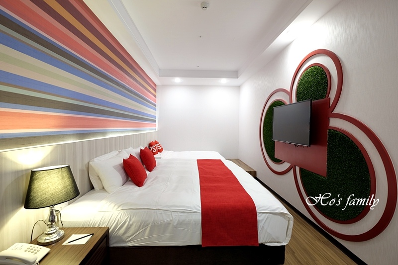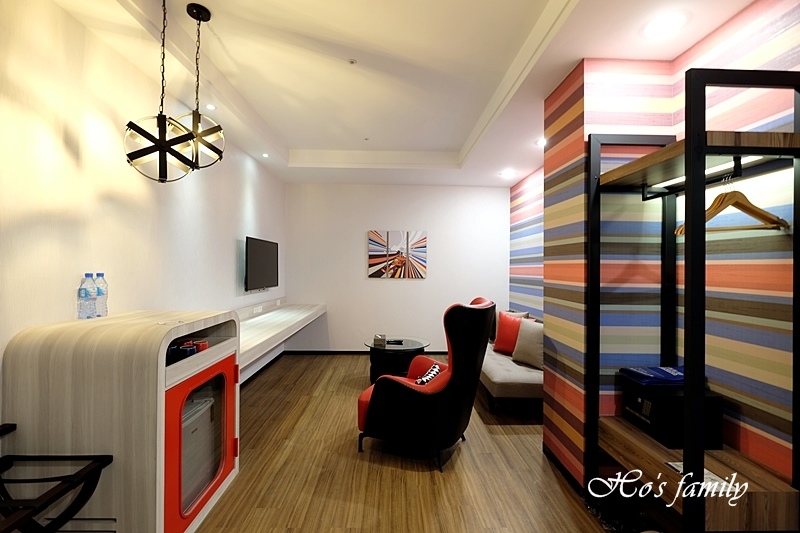 來到臥房,延續賽車風格設計,有兩張king size的雙人床,而且還有電視ㄟ!