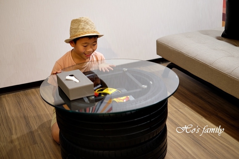 「哇塞,輪胎堆出的桌子好酷,裡頭還有一台小台賽車ㄟ!」眼尖的Yo發現客廳裡的秘密驚喜!