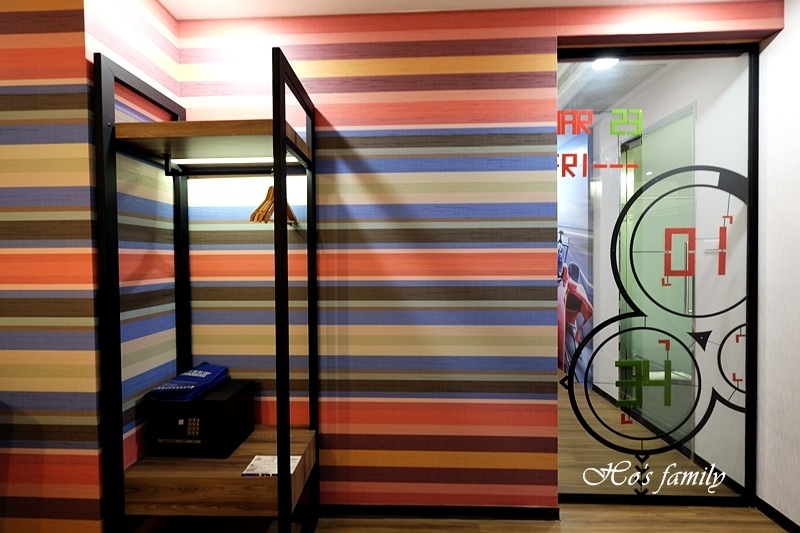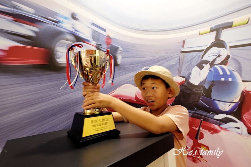特別的是,臥房中牆面特別打造出賽車畫面與頒獎台,模擬出比賽頒獎的氛圍。既然這樣當然要演一下啊,掌聲歡迎冠軍選手Yo哥~~~