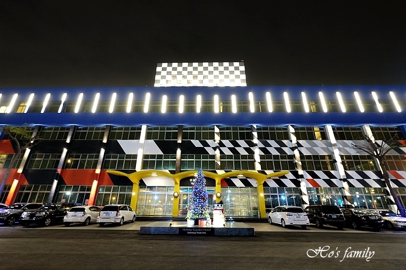 華園大飯店草衙館有著鮮豔的藍色與紅、黑、白、黃等色建構出賽車色系,搶眼的外觀十分引人注目!