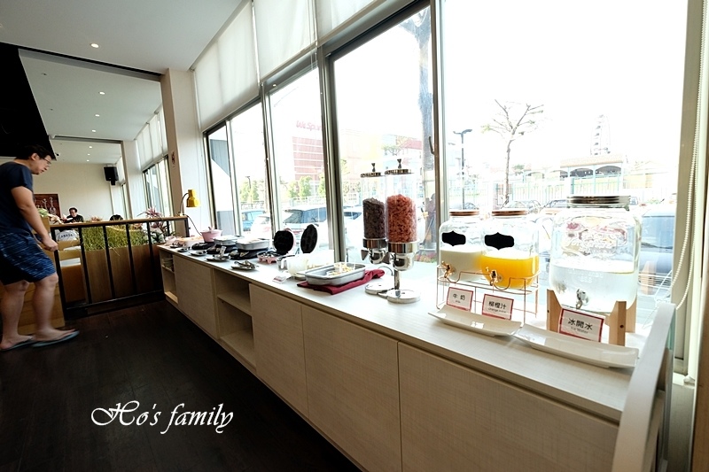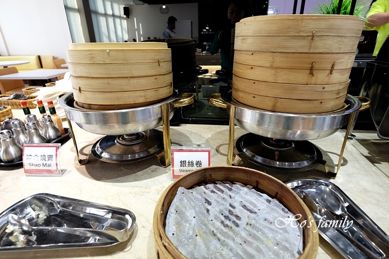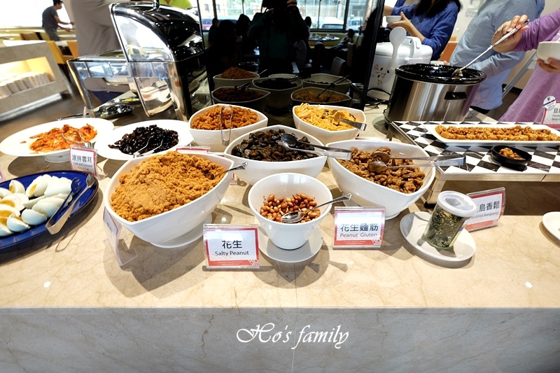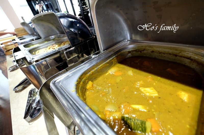 而一般吧台提供各式沙拉、蔬果、粥品小菜、麵包果醬、燒賣、自製鬆餅機等,還有咖哩飯、義大利麵以及滷肉飯,菜色相當豐富。