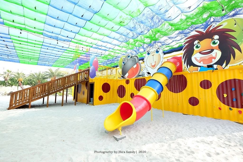 由長頸鹿守護的純白大沙坑樂園面積非常廣闊,使用的是非常好清潔的白色細沙,在裡面跑走也非常舒服,給人來到沙灘般的錯覺。上面特別設置遮陽設施,孩子們來到高雄即使遇到豔陽天也能開心玩沙!
