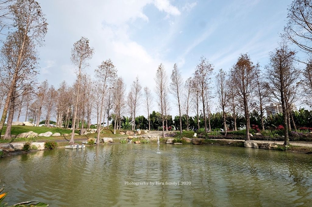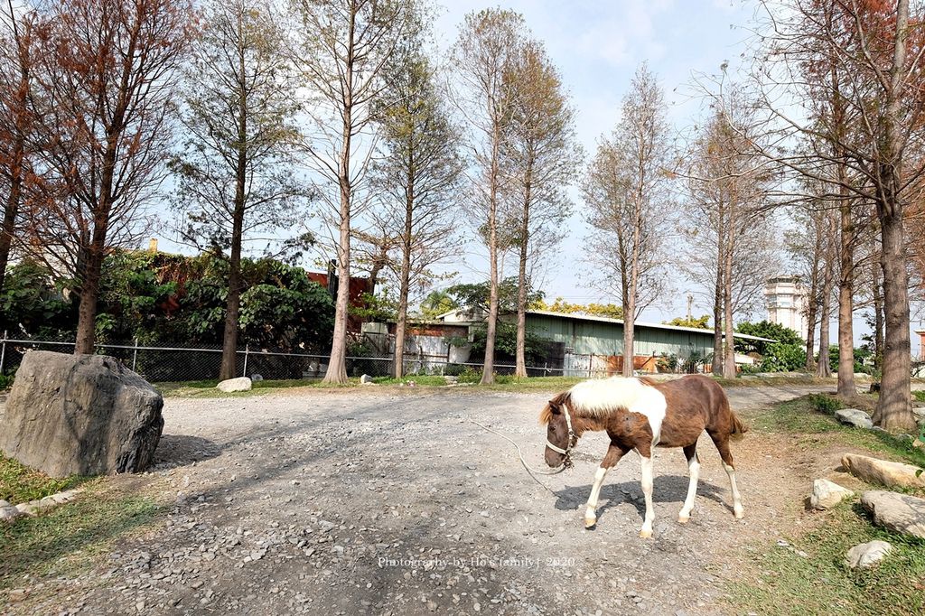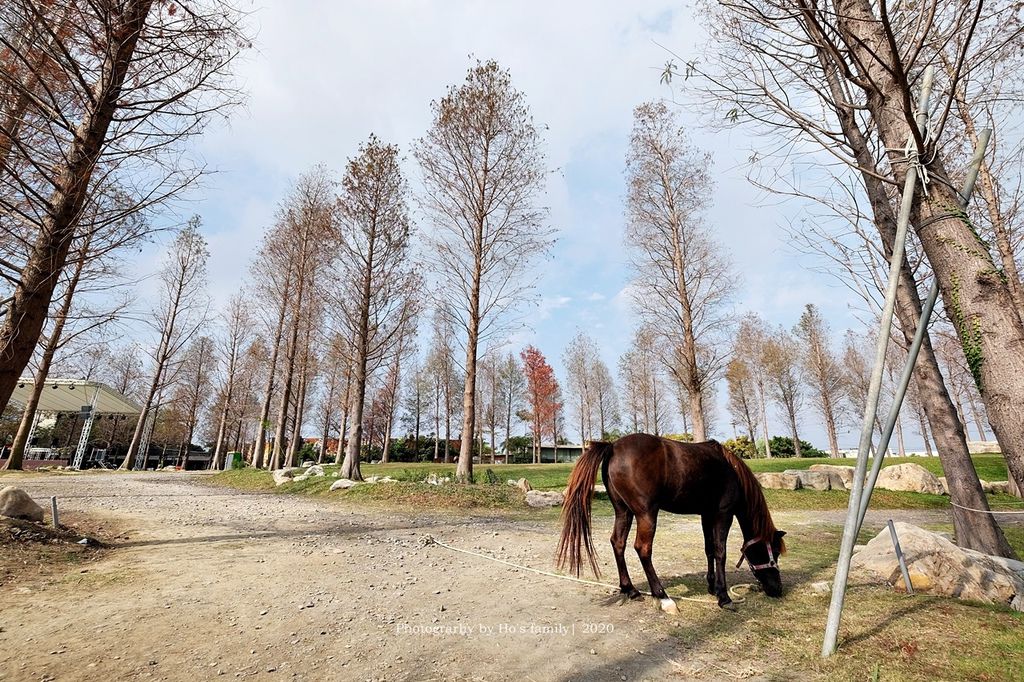 草地帳篷區的另一頭好美啊!廣闊的落羽松林、將天空倒影盡收的水池與悠閒吃著草的馬,織構成美好的畫面,猶如一幅畫般使人心醉…
