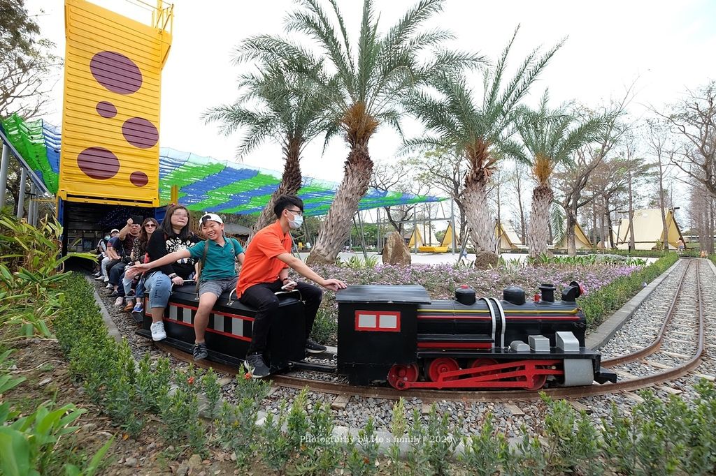 2020年淨園農場機場咖啡的另一個亮點就是「小火車」,目前憑門票一張可兌換坐小火車一次,繞行沙坑樂園一圈,這太吸引人了!10點開始營運,一聽到開放了,大家立刻衝上去排隊,嘟嘟,小火車出發囉!