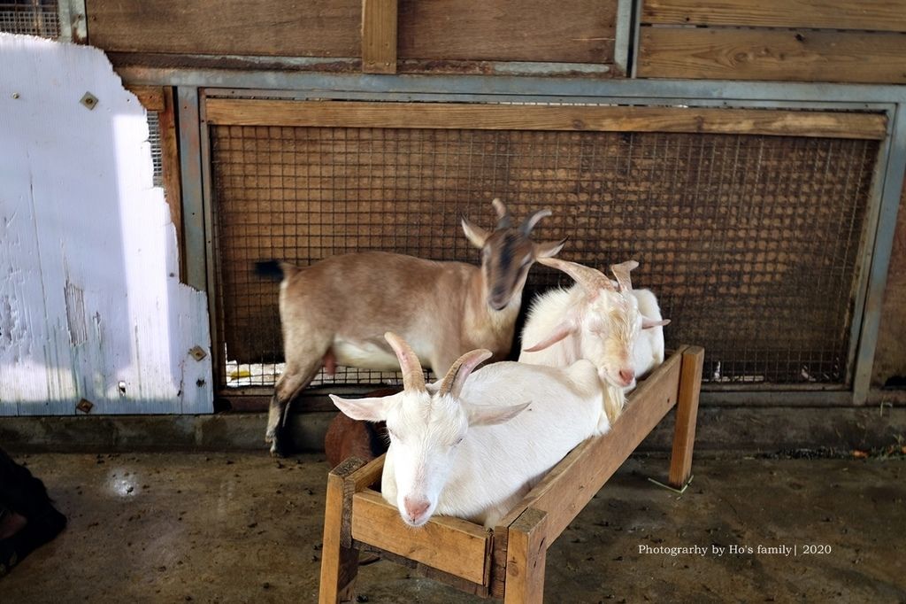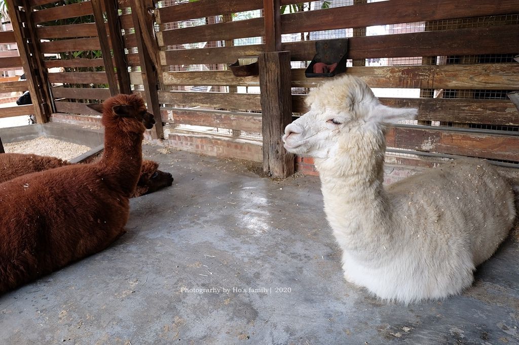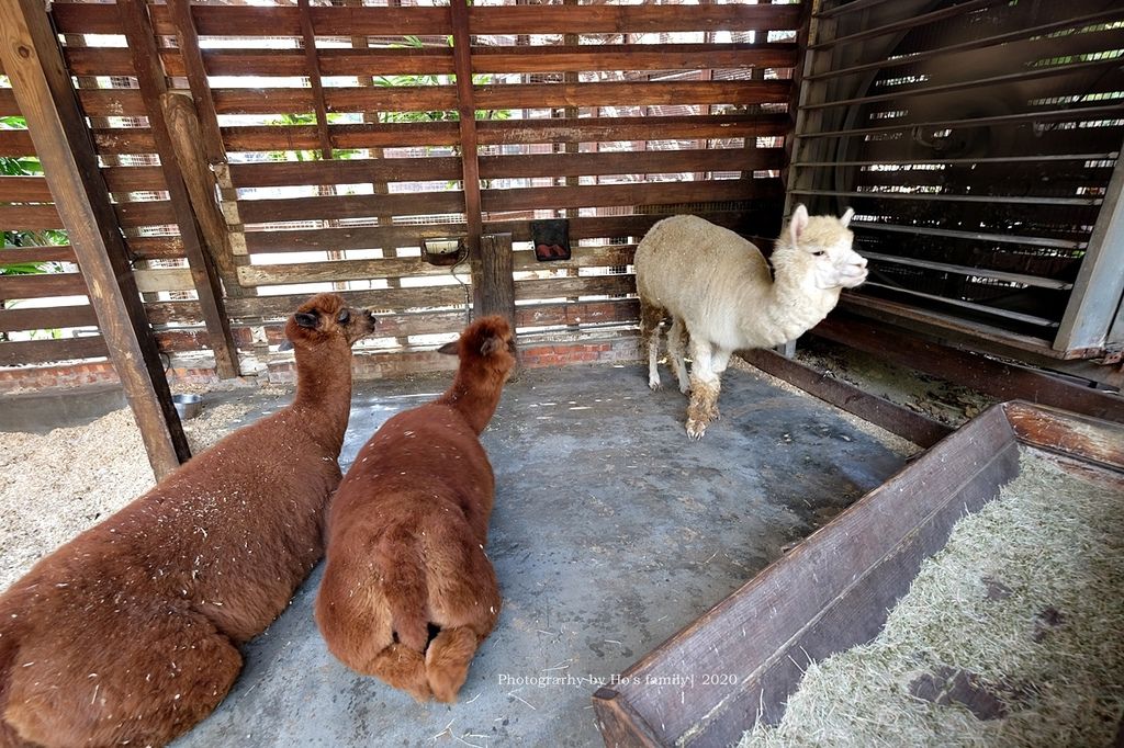 超療癒的羊駝,來的時候牠們一點都不餓,我們還特別留了半把牧草要給他們,可能天氣太熱了,一直待在電風扇前不想出來吃草XD