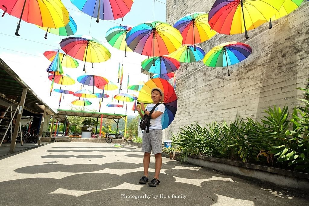 連日來的毛毛雨加上這次來訪時碰上颱風,原先擔心我們的宜蘭小旅行會就此都窩在室內,幸好老天爺給了一給好天氣,我們在初開門時抵達,工作人員正在布置彩虹傘廊道,一把把鮮豔的小雨傘高掛於空中形成數大便是美的美景,在藍天照映下景致怡人!