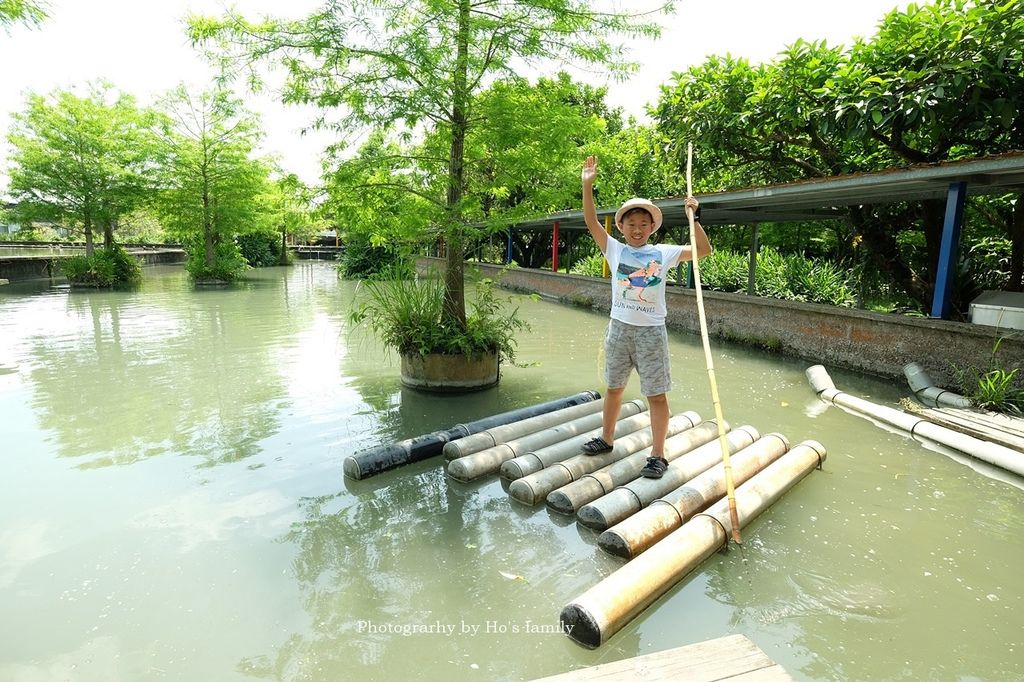 勝洋水草休閒農場的竹筏是「膠筏」,來得相對穩固,Yo這樣的大小孩就能自己操作!工作人員為我們將膠筏用竹子牽引過來後,Yo出發囉!