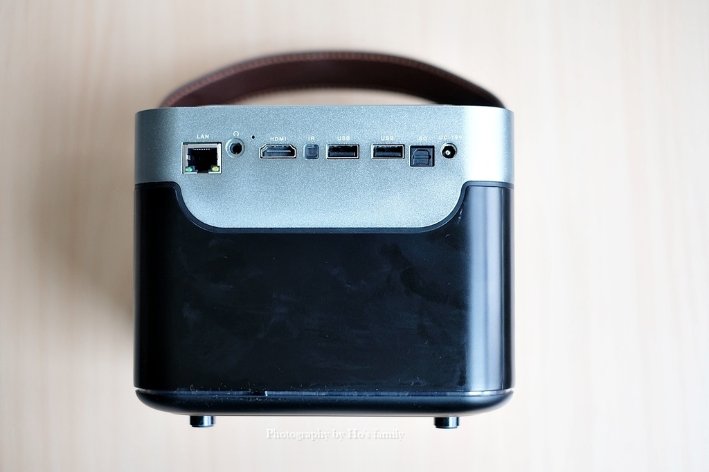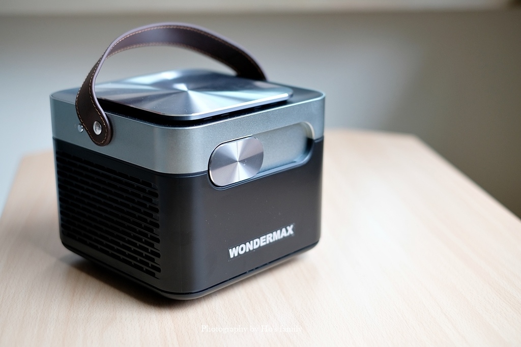 Wondermax AP3 Plus 投影機外型真的很美,兼具時尚科技感,上面附個皮帶提把,相較於一般專業的投影機來說,體積輕巧,僅有將近2公斤,大小是170 x 170 x 137 mm。