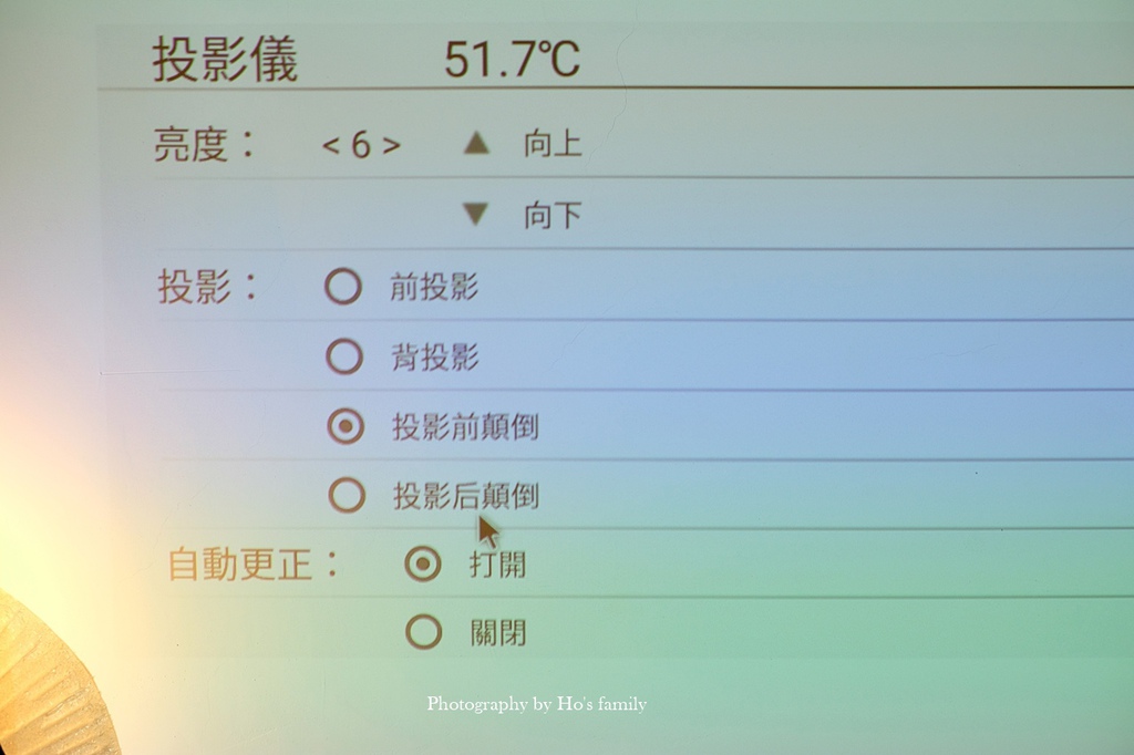 我們讓Yo躺在床上看卡通,將影像投影在天花板,Wondermax AP3 Plus 投影機有亮度及影像調整方向的選擇,選擇「自動校正」,機器就會將影像完全調整好,真的好聰明!