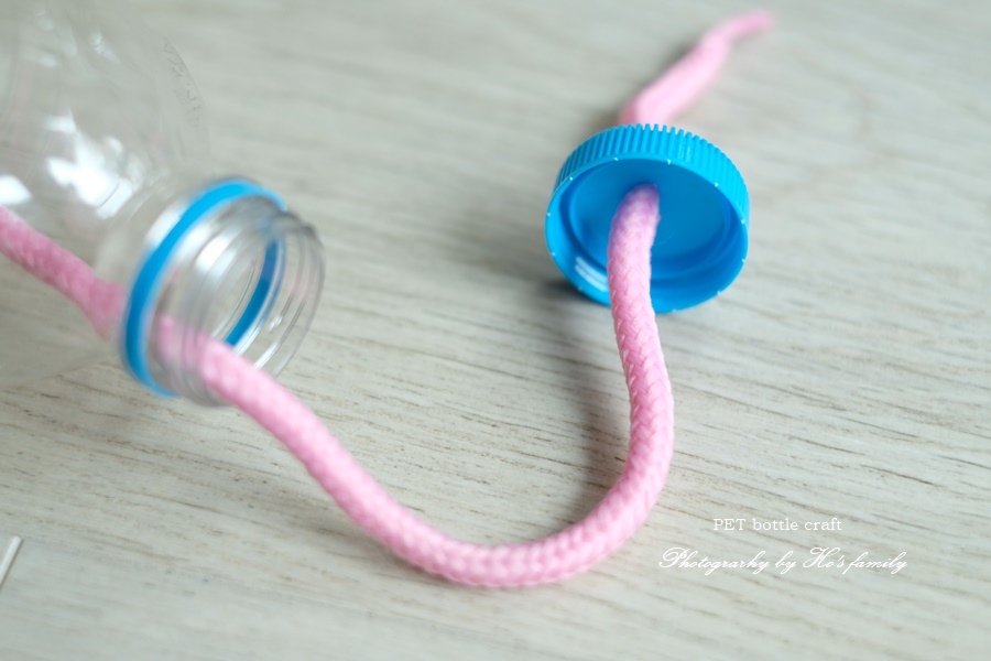 (4)將寶特瓶的瓶蓋中間打洞,把繩子穿進去後,在瓶蓋裡面打結。
